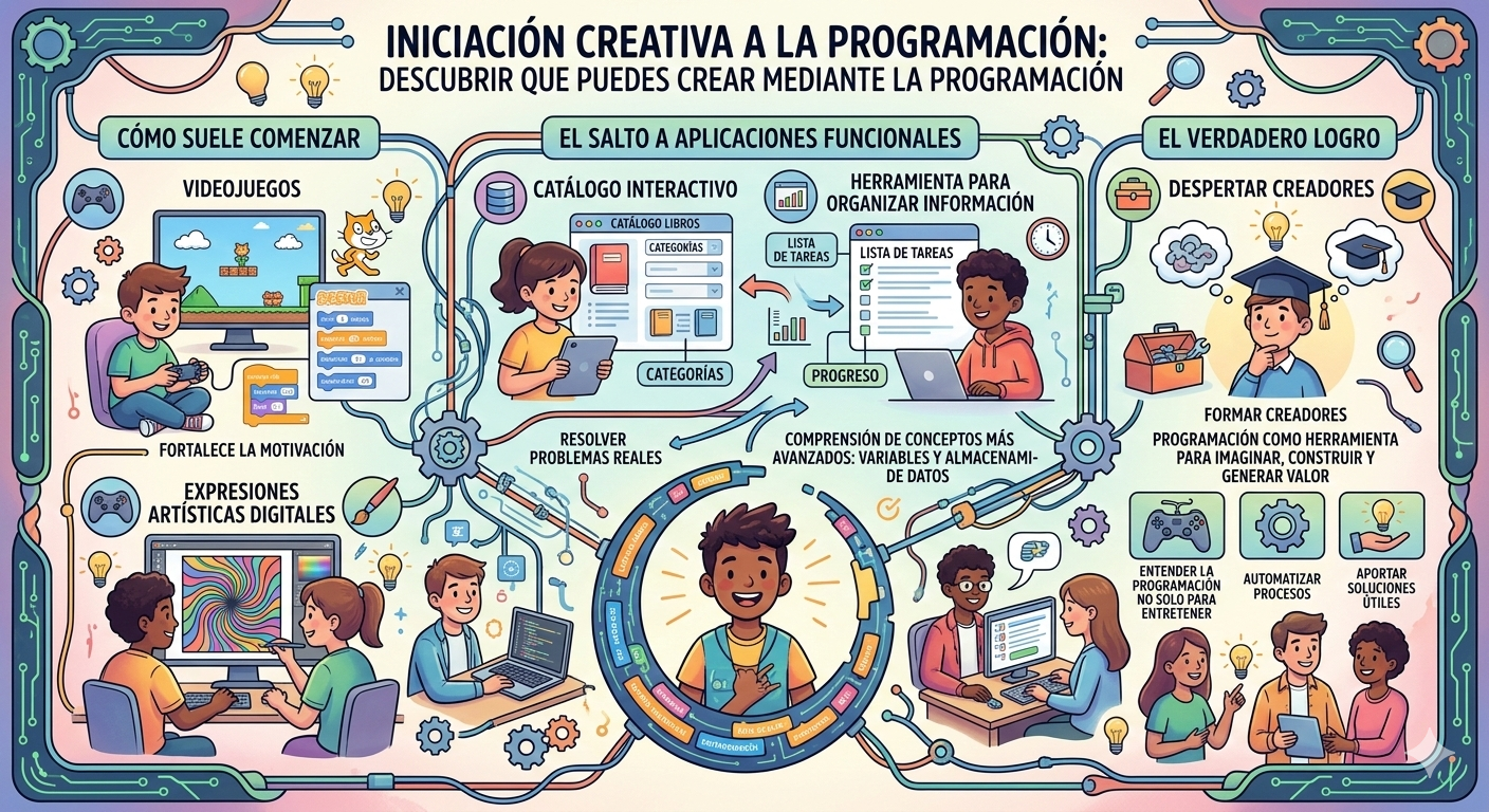 El docente debe ofrecer experiencias variadas —videojuegos, arte digital y aplicaciones prácticas— para que cada estudiante descubra qué tipo de creación conecta mejor con su motivación. El verdadero logro en esta etapa no es formar expertos en código, sino despertar creadores que entiendan la programación como una herramienta para imaginar, construir y generar valor.