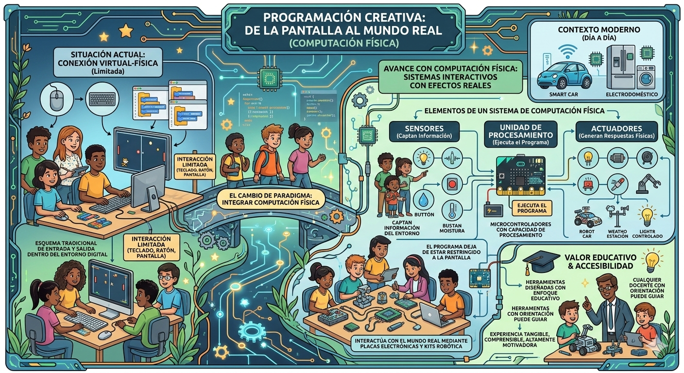 En educación, este contexto favorece el trabajo con computación física mediante placas electrónicas y kits de robótica que permiten crear sistemas con efectos reales. Todo sistema de este tipo se basa en tres elementos: una unidad de procesamiento que ejecuta el programa, sensores que captan información del entorno y actuadores que generan respuestas físicas.