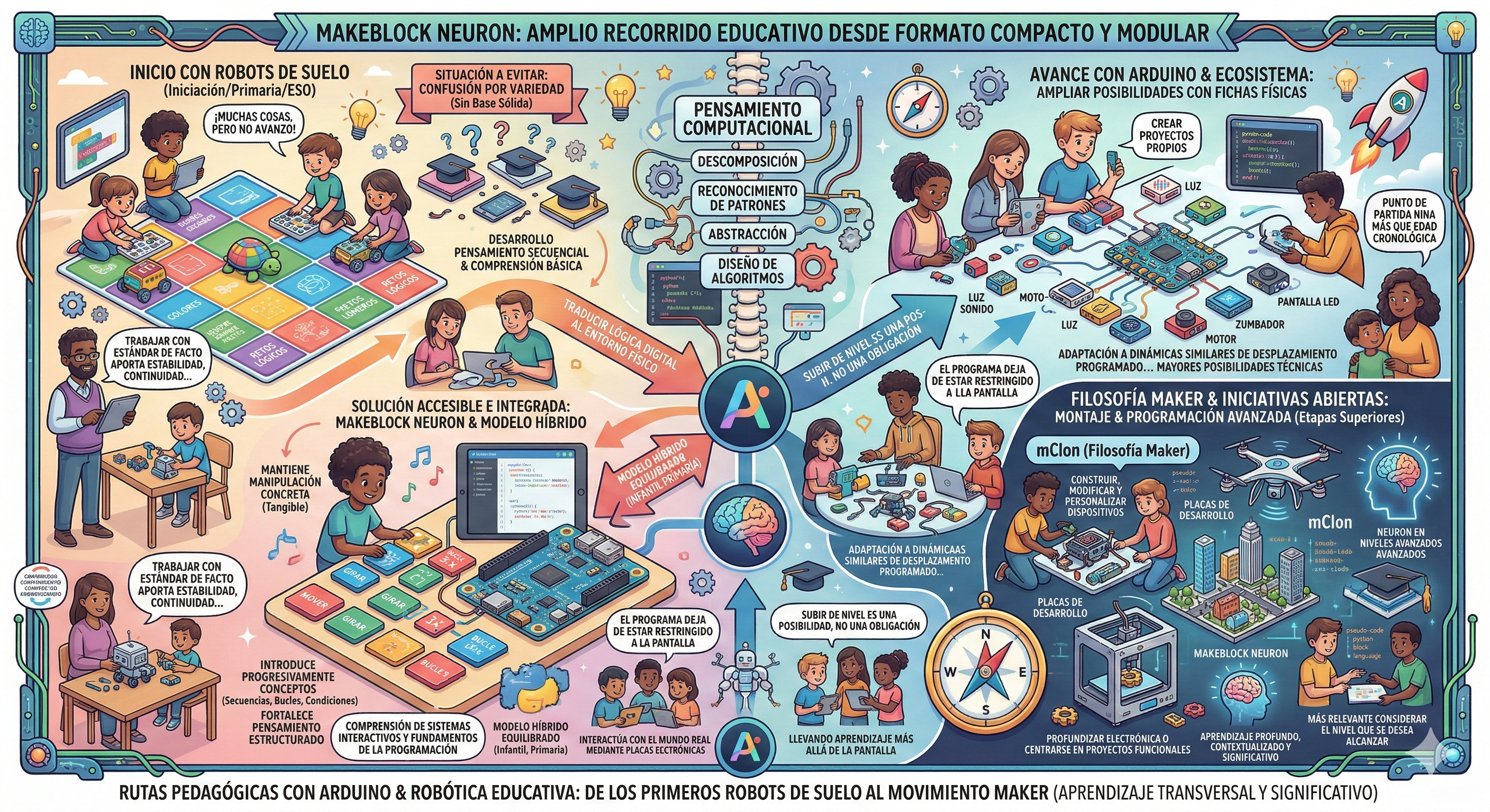 Existe una categoría de propuestas que ofrecen un amplio recorrido educativo desde un formato compacto y modular. Un ejemplo especialmente representativo es Makeblock Neuron, desarrollado por Makeblock.