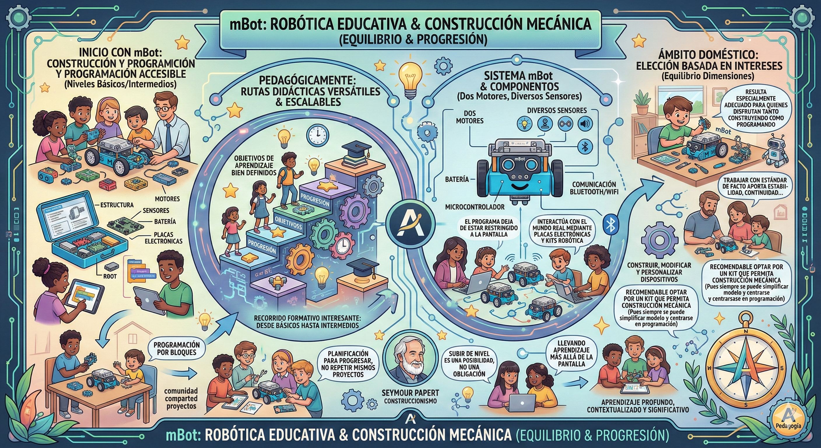 El mBot es un kit de robótica educativa orientado a etapas iniciales que combina programación accesible con posibilidades reales de construcción mecánica. A diferencia de propuestas más centradas únicamente en la programación, mBot incluye estructura, motores y sensores que permiten montar un robot funcional y, a partir de ahí, modificar o ampliar el modelo.