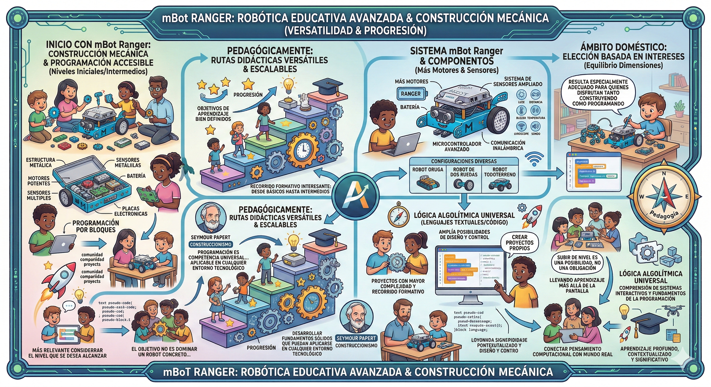 No obstante, sigue siendo importante entender que ningún kit debe convertirse en el único referente del aprendizaje. Aunque el mBot Ranger ofrece mayor proyección y continuidad, lo esencial es que el estudiante comprenda que la programación es una competencia universal, transferible a múltiples plataformas y dispositivos. El objetivo no es dominar un robot concreto, sino desarrollar fundamentos sólidos que puedan aplicarse en cualquier entorno tecnológico.