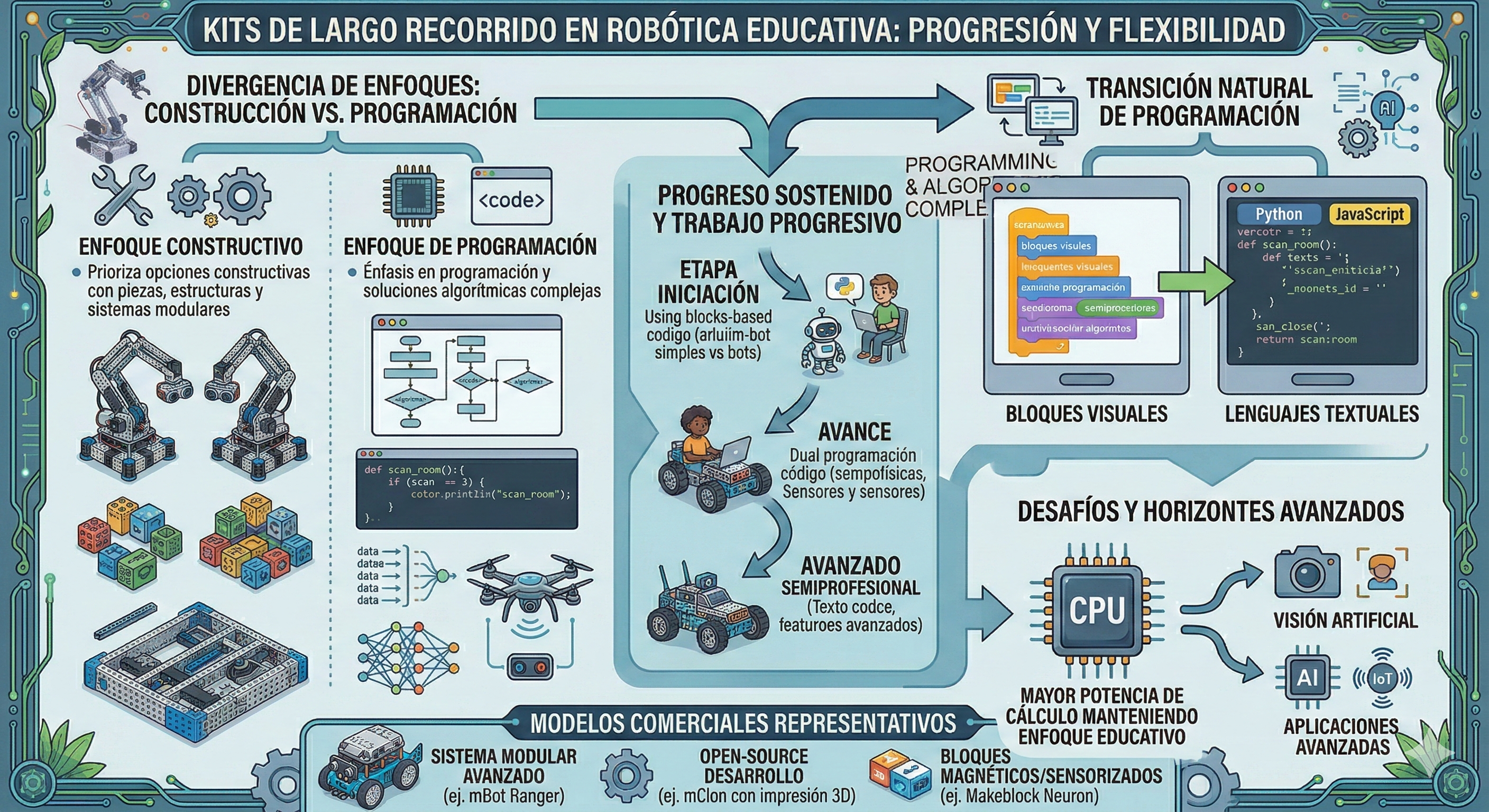 Al igual que ocurre con los kits de iniciación, en los kits de largo recorrido es posible distinguir entre aquellos que priorizan las opciones constructivas —mediante piezas, estructuras y sistemas modulares— y aquellos que ponen el énfasis en las posibilidades de programación y el desarrollo de soluciones algorítmicas más complejas.