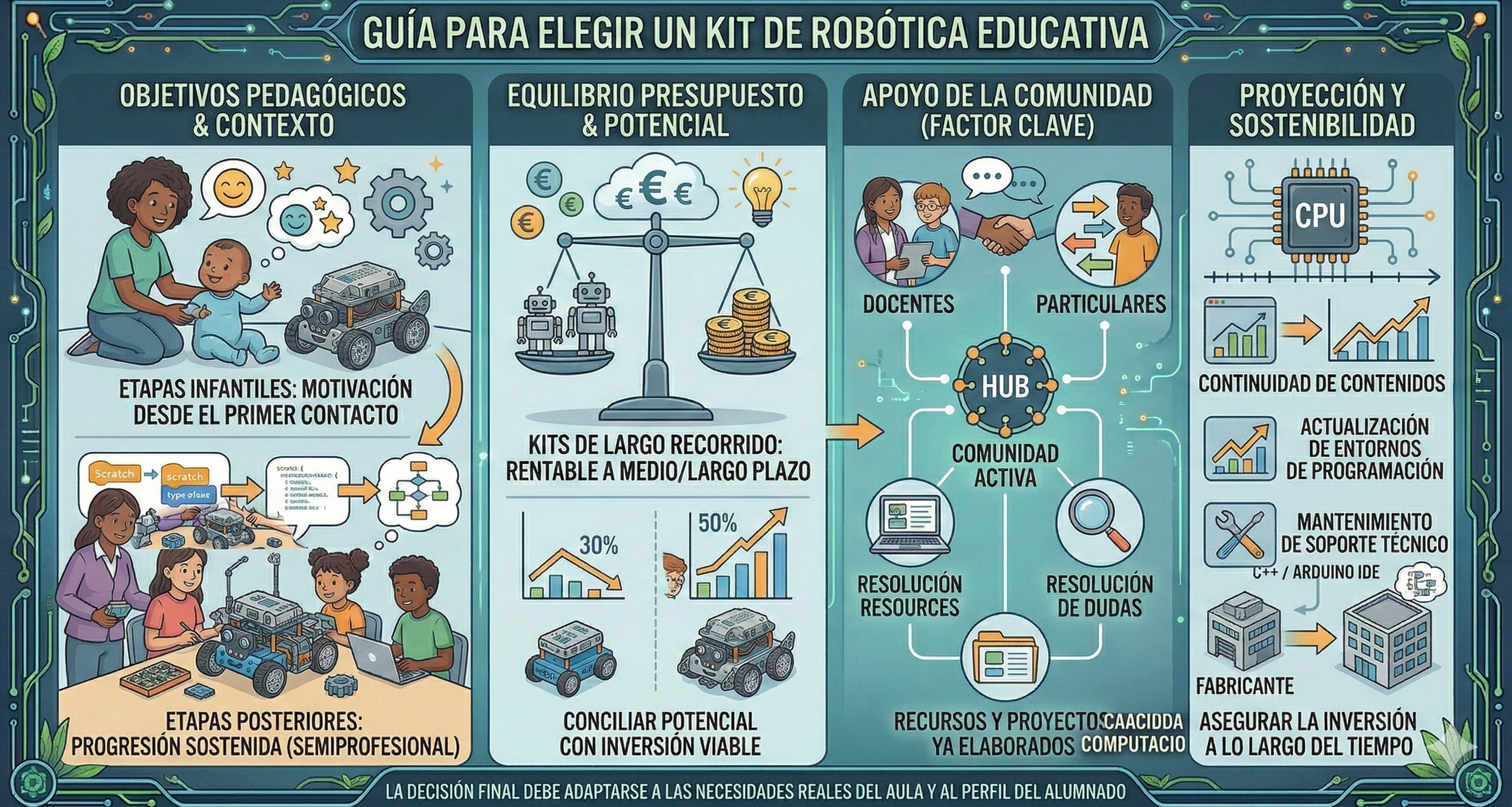 Contar con una comunidad activa de usuarios —tanto docentes como particulares— es un factor clave. No solo garantiza acceso a recursos, proyectos y materiales didácticos ya elaborados, sino también la posibilidad de intercambiar experiencias y resolver dudas. Del mismo modo, conviene valorar la proyección futura del fabricante: la continuidad en el desarrollo de contenidos, la actualización de los entornos de programación y el mantenimiento del soporte técnico son aspectos fundamentales para asegurar la sostenibilidad de la inversión a lo largo del tiempo.